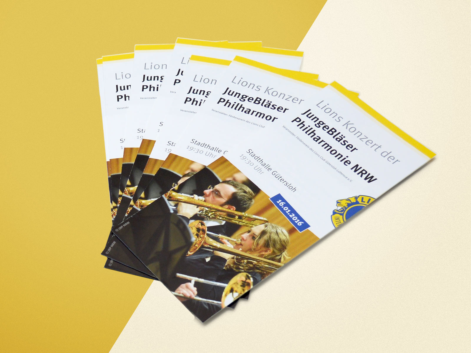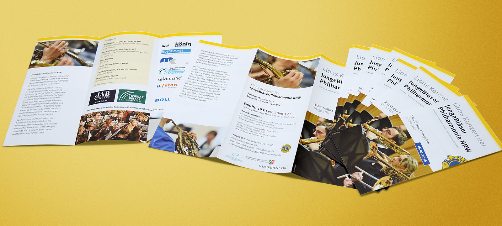 Begleitende Printwerbung zum Lions Konzert der Junge Bläser Philharmonie NRW: Flyer und Plakat für die Vorankündigung, Programmheft für den Konzertabend. Veranstalter ist der Lions Club Gütersloh-Lutteraue.